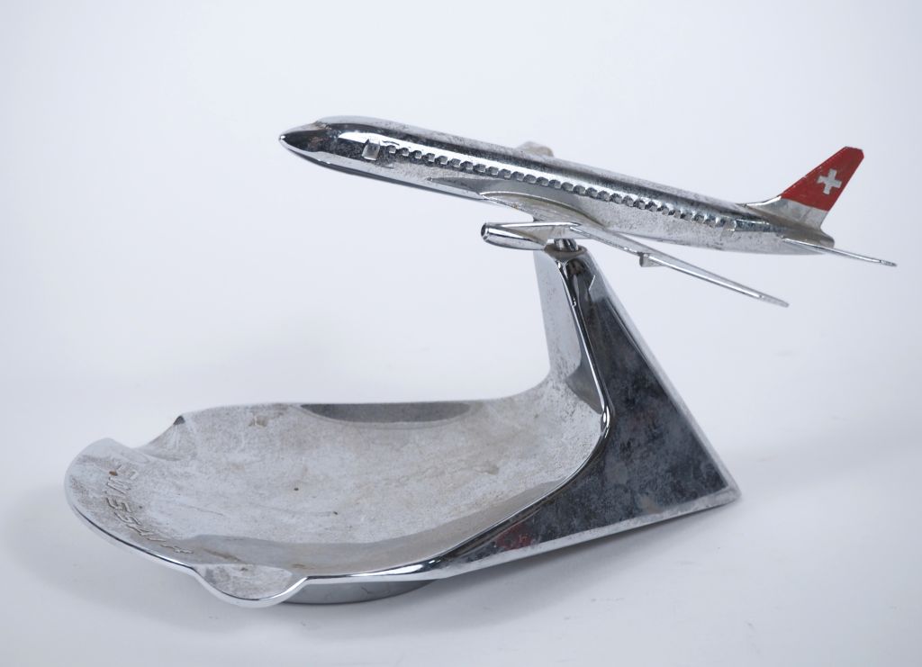 Lot de Coupelle et avion chromé Suiss Air. au prix de 50 à 80 € en vente aux enchères par l'hôtel des ventes Primardeco