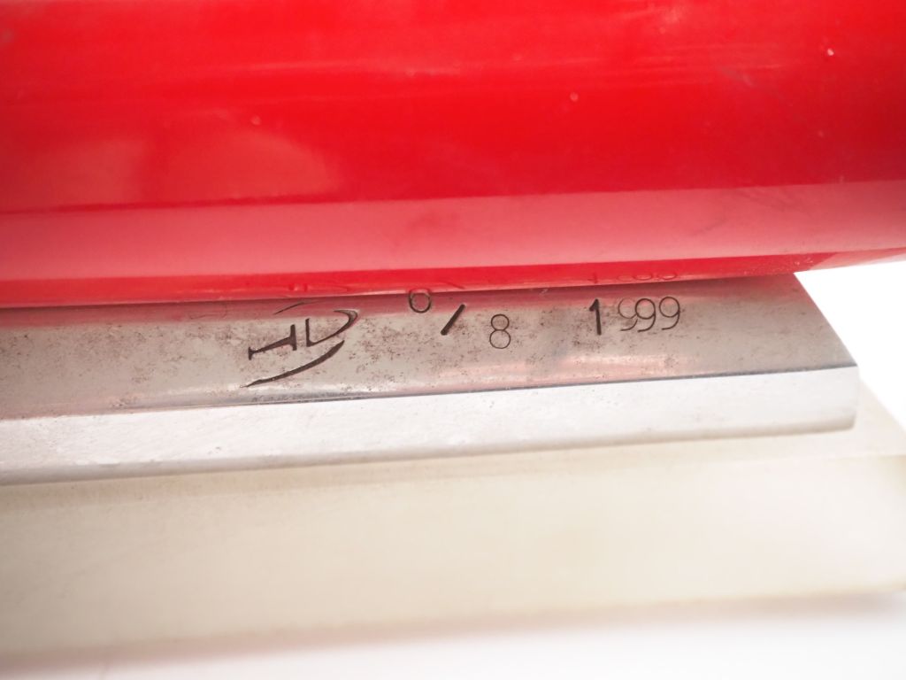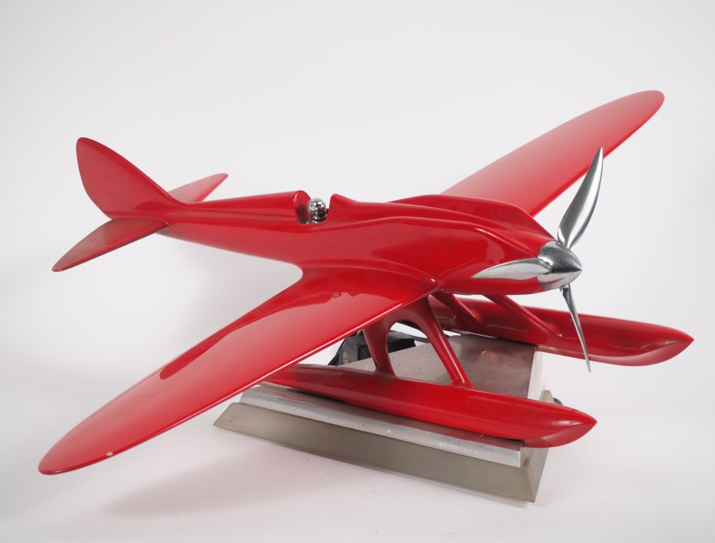 Sculpture en métal laqué rouge et chromé figurant un hydravion Macchi monogrammé HD, numéroté 6/8 et daté 1999. Base électrifiée Dim. 26 x 55 x 71 cm (micro éclat sur une des ailes)