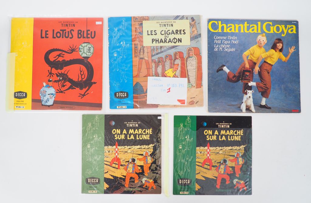 5 Disques 1957 DECCA (Lotus bleu TBE (petites marques sur le disque), On a marché sur la lune (disque pas ecoutable, pochette Neuve)+ On a marché sur la Lune BE + Les Cigares du Pharaon BE (pochette un peu abimée) + 1 disque chantal Goya