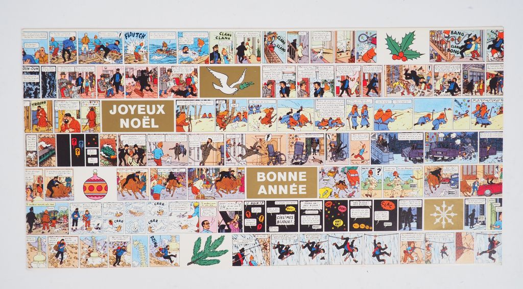 Carte de vœux 1973/1974 : Série de strips : Les bijoux de la Castafiore,Coke en stock,L'affaire Tournesol ….Signée Hergé.Parfait état .