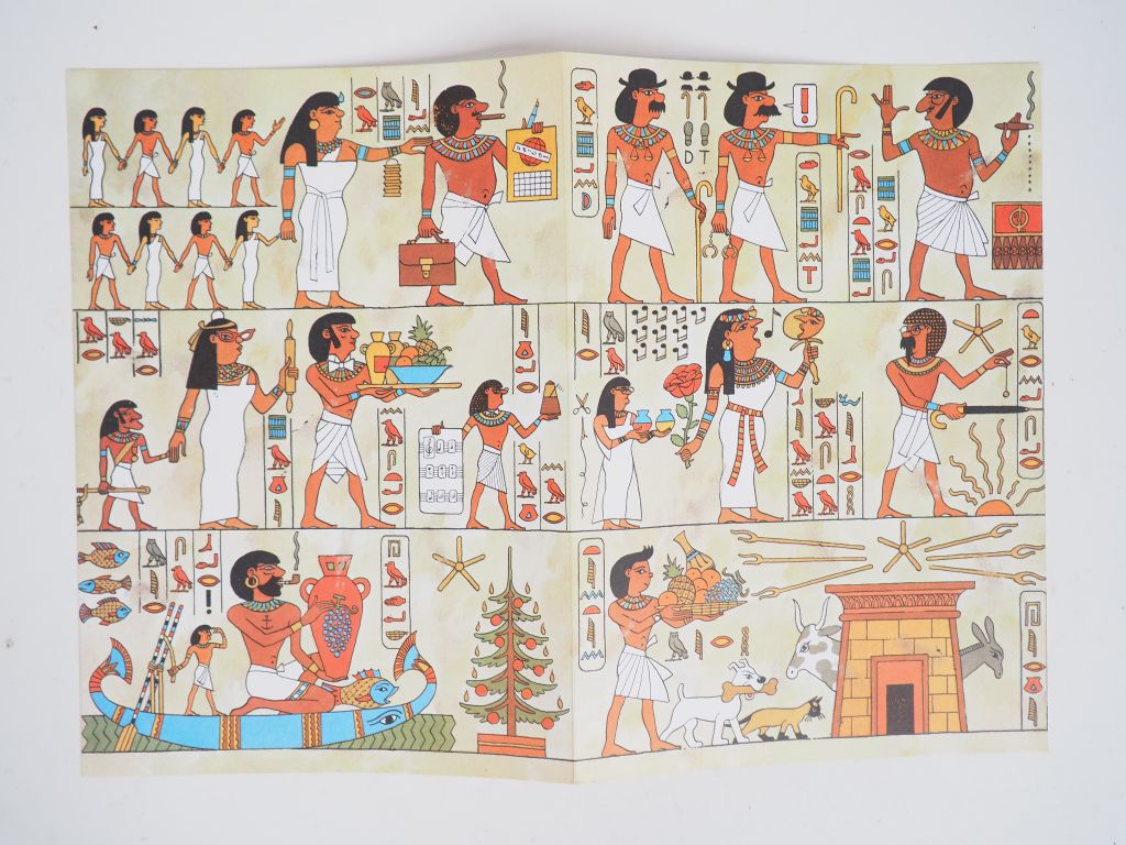 Carte de vœux 1978/1979 : Imitation d’une fresque égyptienne. Tintin et ses amis rendent hommage à la créche. Non Signée.