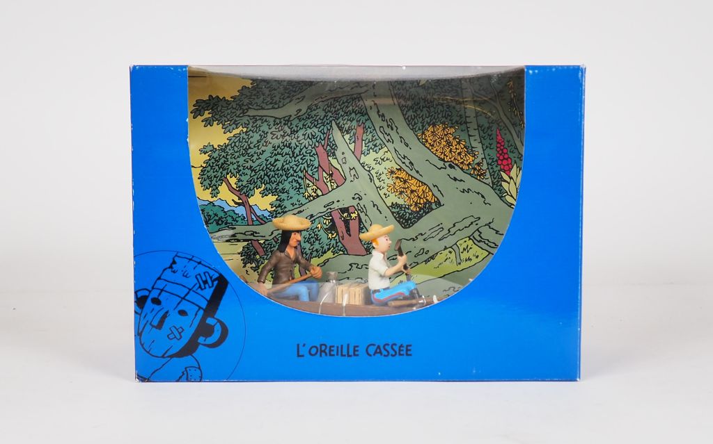 Ref 43000 TINTIN Collection DIORAMA Couverture Album"L'oreille Cassée" Pirogue Tintin,l'indien et Milou 28 x16x20 cm 2005 TBE