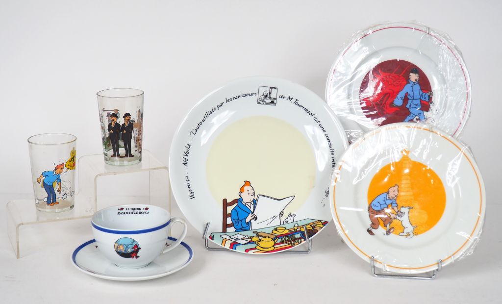 Tasse Rackham le rouge (recollé au niveau anse) et sous tasse + Assiette plate PDJ les 7 boules de Cristal (1998) + 2 Assiettes Table et couleurs "Tintin au Tibet" et Le "Lotus Bleu" + 2 verres Lombard 1986 (Dupont et Tintin)