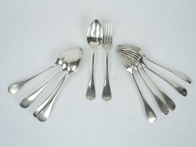 5 couverts et une fourchette en argent, poinçon Minerve, modèle uniplat. Poids : 856 g