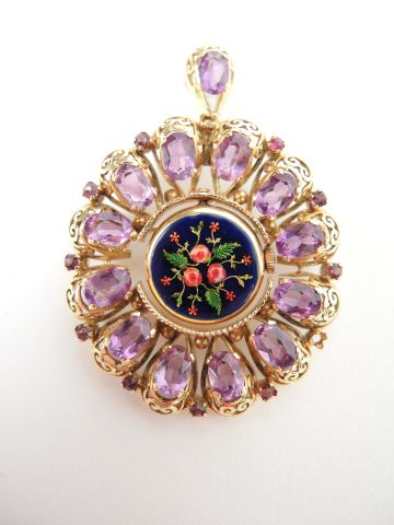 Broche pendentif monture en or ajouré, petite montre émaillée au centre, entourage de 12 améthystes taille ovale (manques, charge de contrôle). Poids tel: 21,8gr