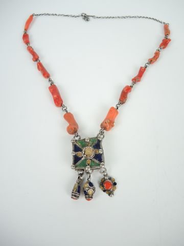 Collier berbère en argent bas titre, corail et émaux polychromes fin XIXe, début Xxe