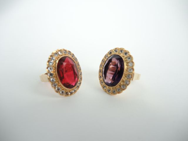 Deux bagues, monture en or, ornées en leur centre d'une pierre rouge ou violette entourage de pierres à l'imitation du diamant. TDD51, 17,3gr tel
