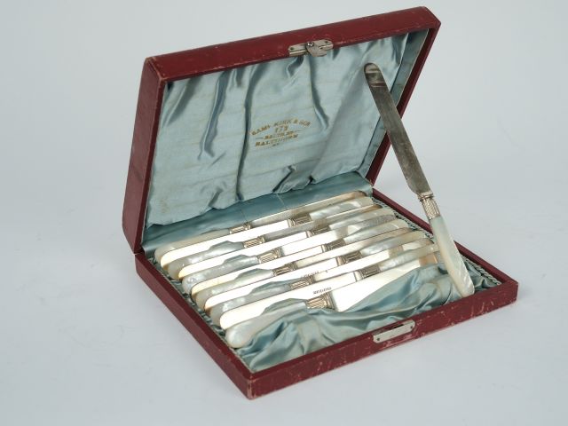 Suite de 12 couteaux à fruit, lames en argent anglais, manches en nacre. Dans son écrin.
