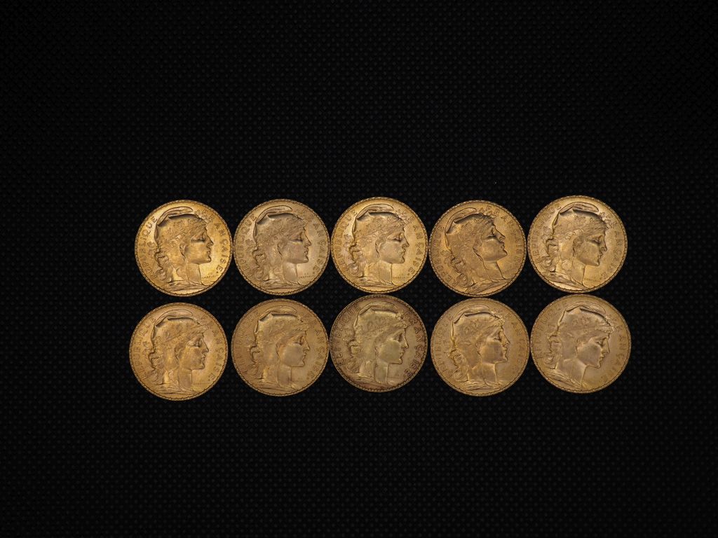 10 pièces de 20 Francs or : 1910, 1913, 1907, 1910, 1910, 1909, 1910, 1910, 1907, 1910