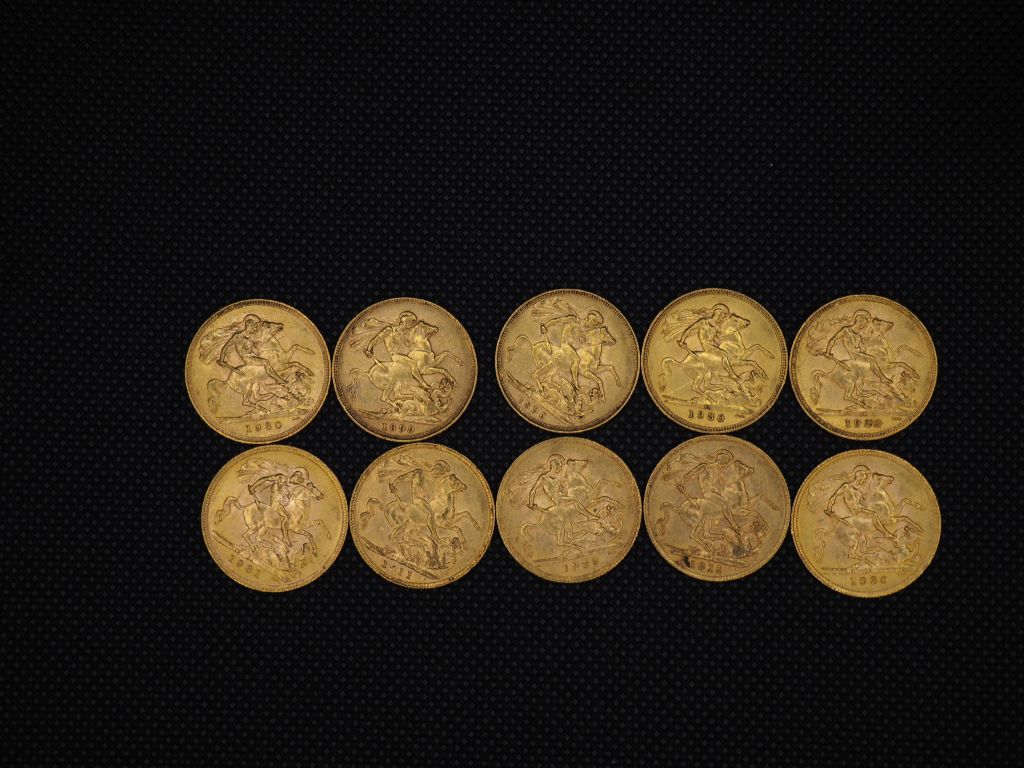 10 souverains or : 1899, 1896, 1930, 1929, 1930, 1917, 1911, 1930, 1931, 1929