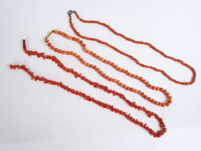 3 différents colliers de corail, dont un fermoir en or. (un accidenté)