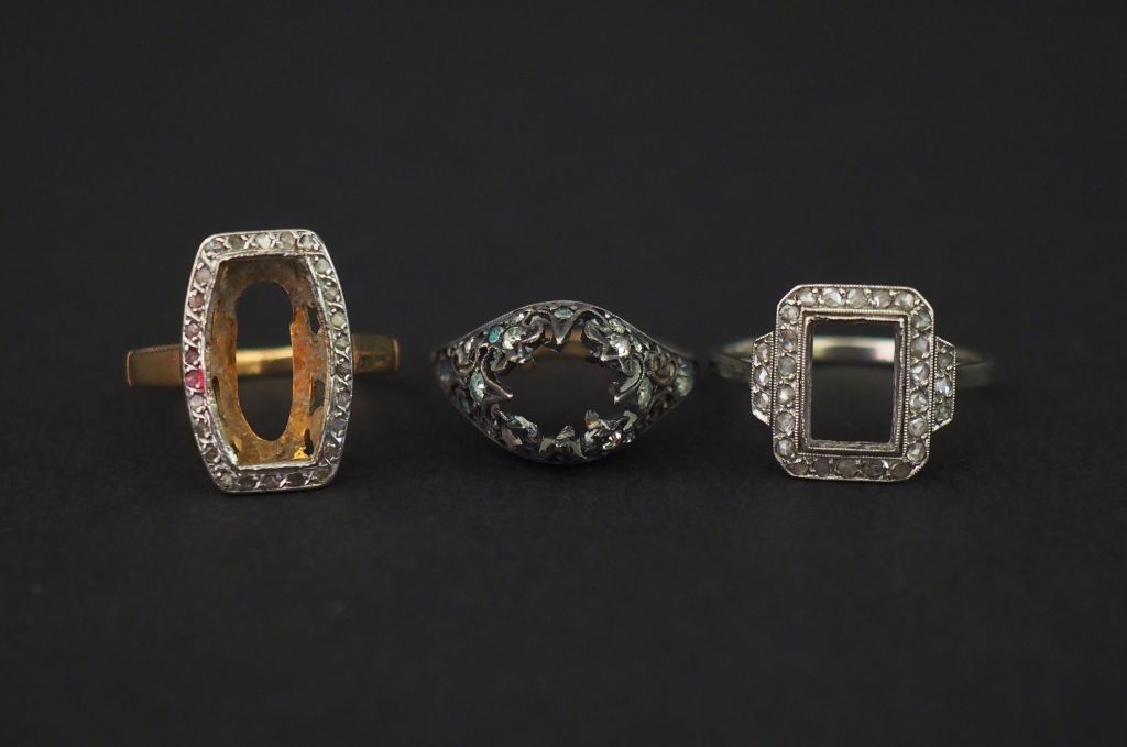3 montures de bagues anciennes en or, platine et argent (?). Poids tel : 10 g