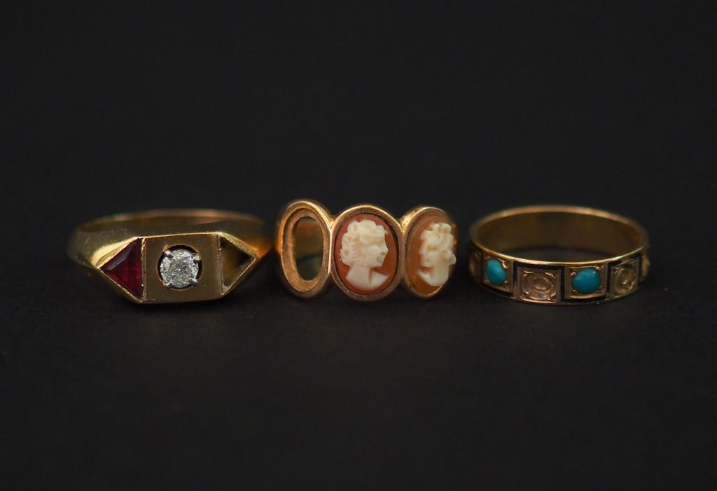 3 montures de bagues en or, pierres et camées. Poids tel : 9,50 g