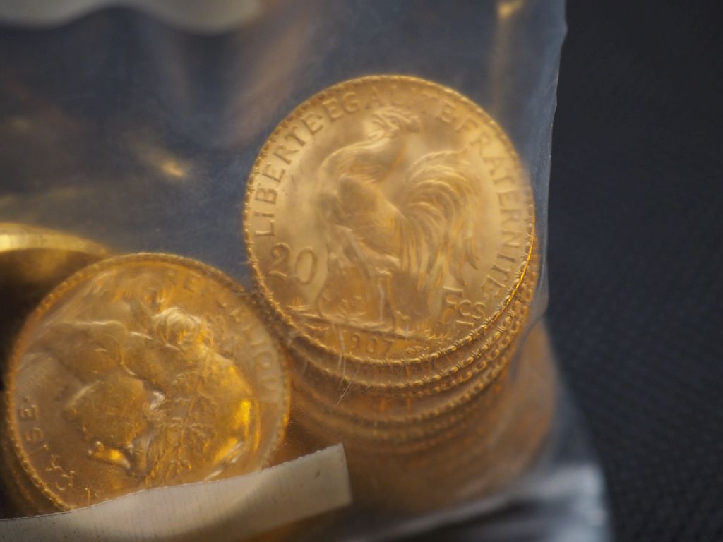 50 pièces de 20 Francs or (dates visibles 1907, 1909) Dans un sachet sous scellé de Banque