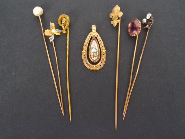 6 épingles à cravate monture or ou métal doré. On y joint un pendentif émail monture or.
