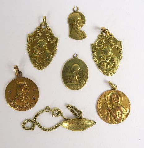 6 médailles de baptêmes en or (gravées), gourmette en or. Poids : 22,9 g