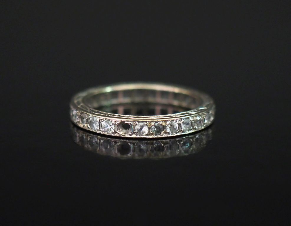 Alliance américaine en or blanc 750, sertie de pierres à l'imitation du diamant. TDD. 57 Poids tel. 4,36 g (manque)