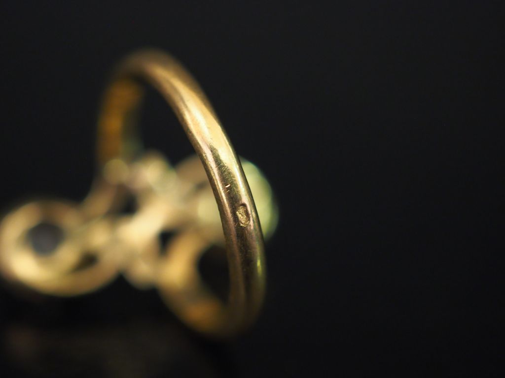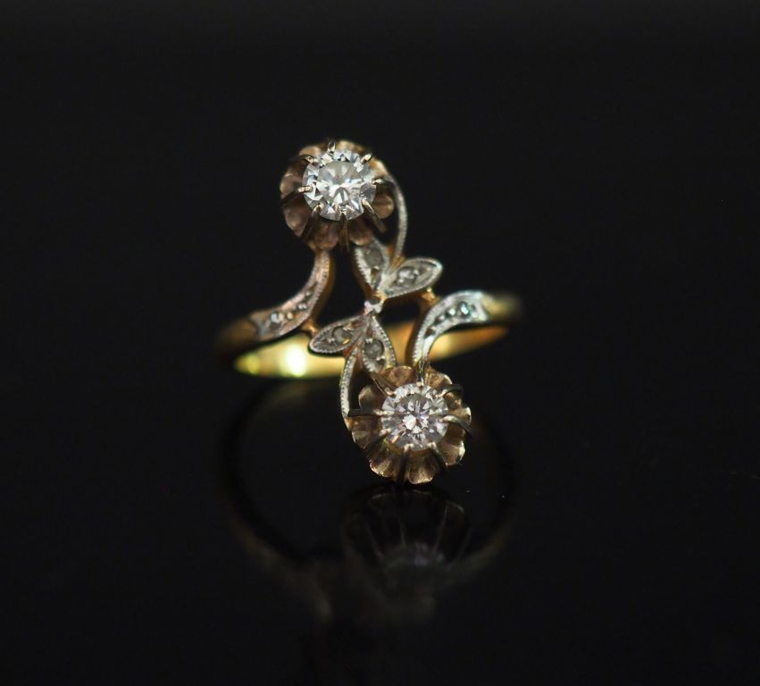 Bague 1900 dite "Toi et Moi" en or jaune, sertie de deux diamants et de petits éclats de diamant. TDD. 52 Poids tel : 4 g