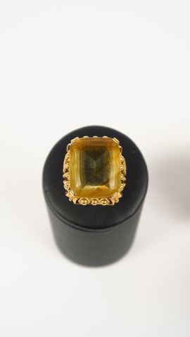 Bague 1900 en or jaune, belle monture ajourée ornée d'une citrine. 11 g
