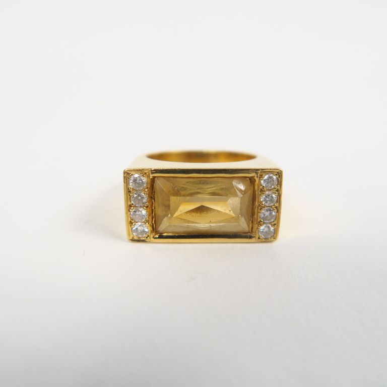 Bague 1940 en or jaune, ornée d'une pierre de couleur et de petits brillants. Poids tel. 12 g
