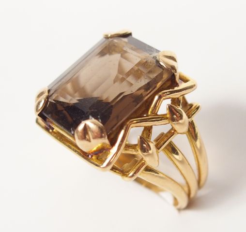 Bague 1950 en or jaune, ornée d'un quartz fumé taille rectangulaire de 10ct environ, monture ajourée à décor de motifs Art Déco. TDD 57 Poids tel: 10,2gr