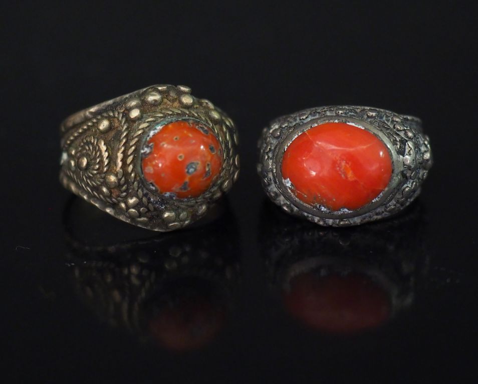 Bague Afrique du Nord en argent et pierre dure en cabochon. TDD. 53 Poids tel. 12 g (pierre dure accidentée) On y joint une bague Afrique du Nord en métal, sertie d'une pierre dure en cabochon. TDD. 59