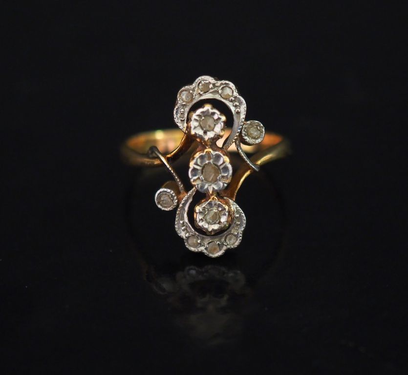 Bague ancienne ajourée en or jaune et pierres à l'imitation du diamant. TDD. 51 Poids tel : 3,07 g