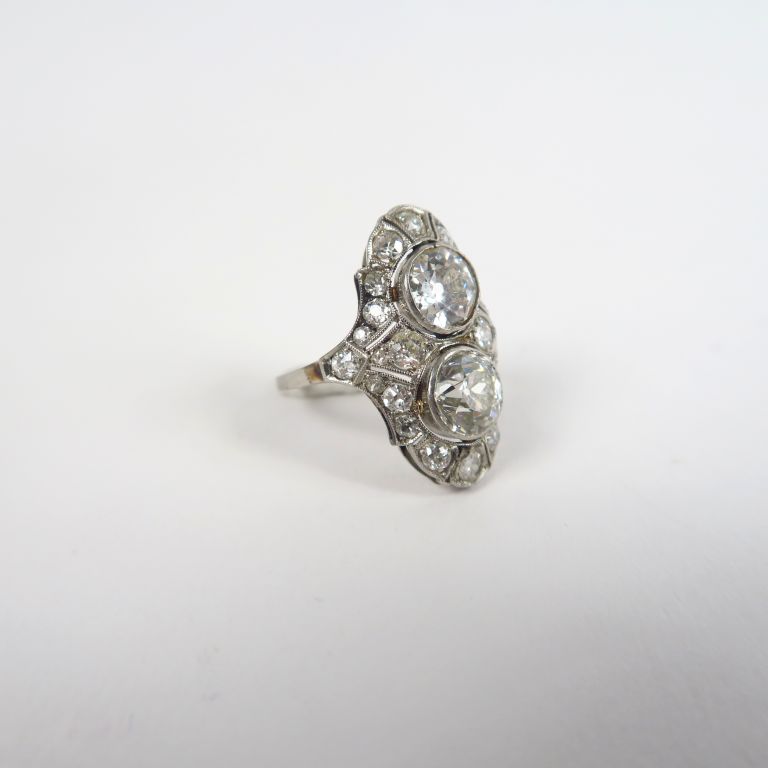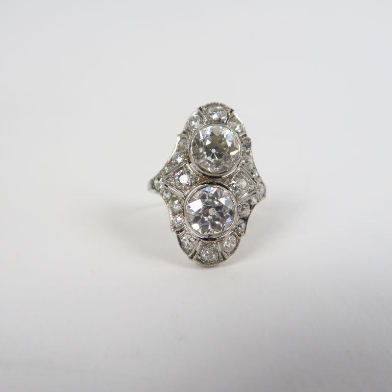 Bague Art déco "Toi Moi" en platine, ornée de deux brillants de 1,25 cts environ chacun, entourage de brillants taille ancienne.