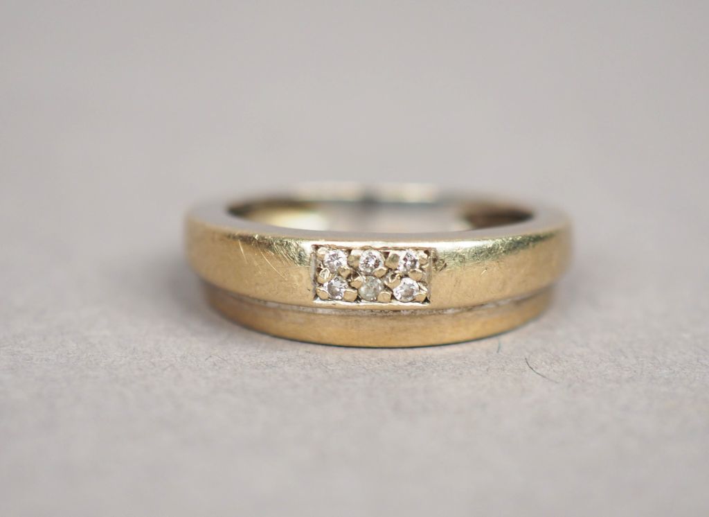 Bague asymétrique en or blanc, ornée en son centre de six petits diamants. TDD. 53 Poids tel. 4,26 g (petit accident à l'un des diamants)