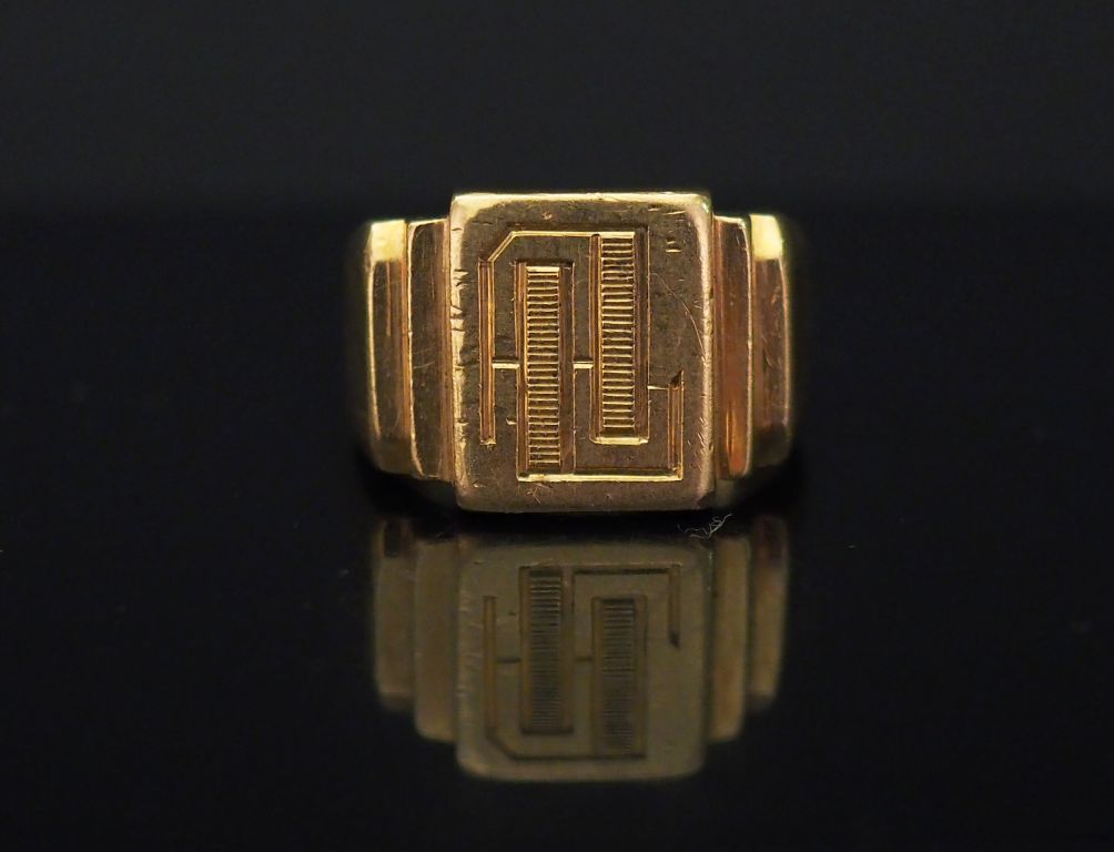 Bague chevalière de femme de style Art déco en or jaune, à décor de monogramme. TDD. 52 Poids. 12,52 g (à charge de contrôle)