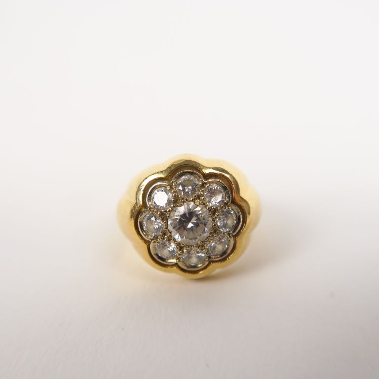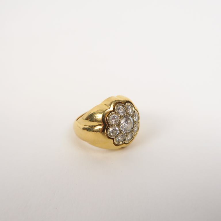 Bague chevalière marguerite en or jaune, ornée d'un diamant central entouré de huit diamants. Poids tel. 19,5 g