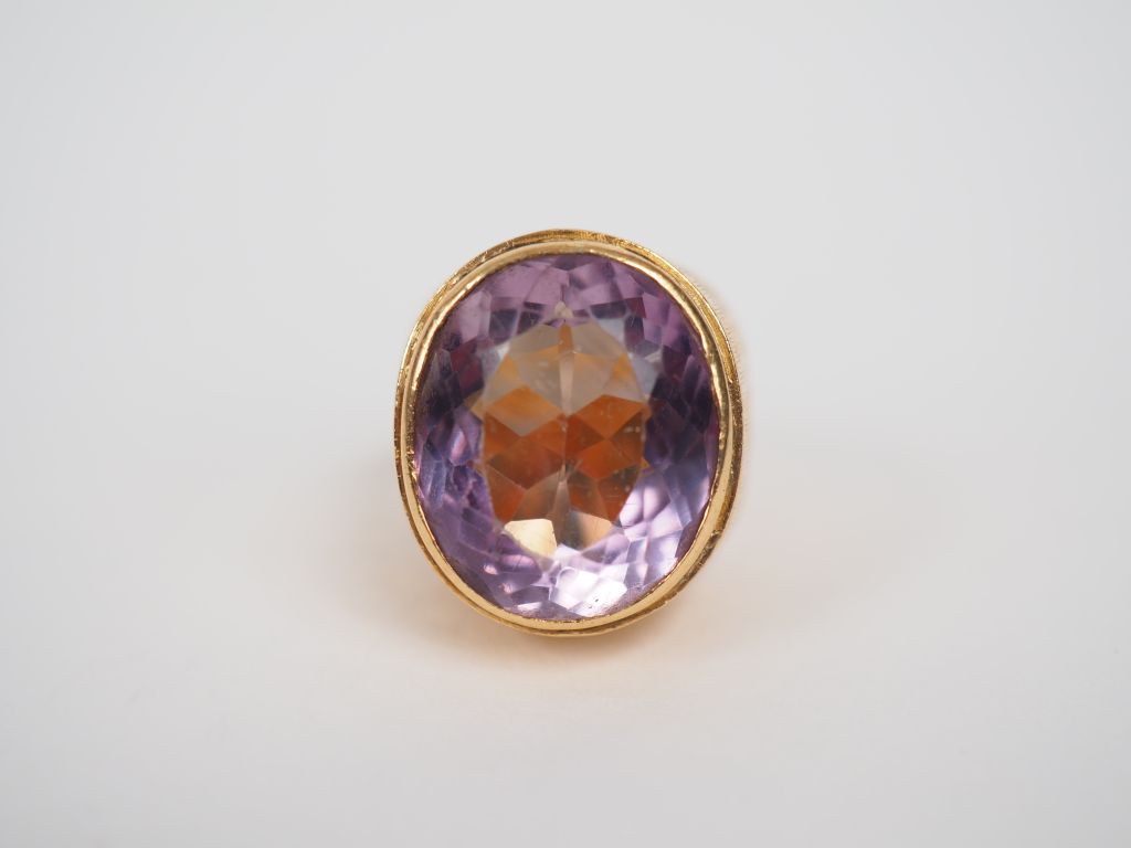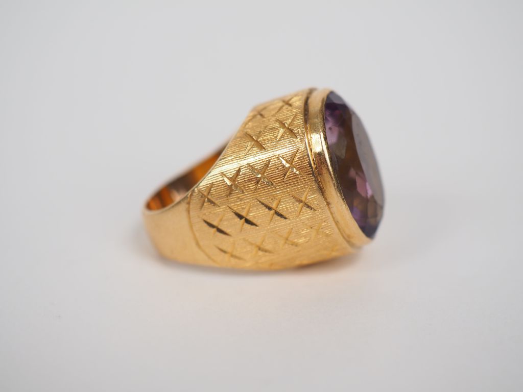 Bague chevalière Napoléon III en or jaune, ornée d'une améthyste en serti clos. Monture, à décor de croisillons. TDD. 45 Poids tel. 10,65 g
