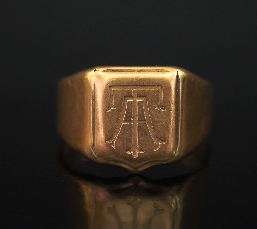 Bague de forme chevalière en or jaune 750, à décor de monogramme. TDD. 63 Poids. 9,67 g