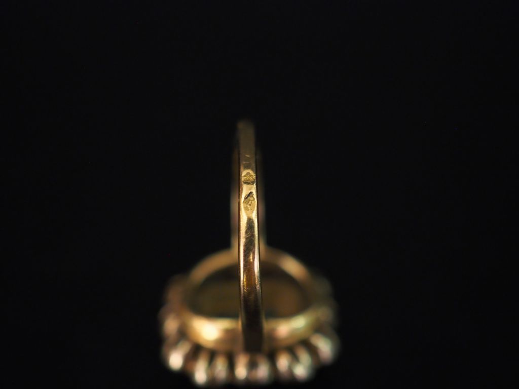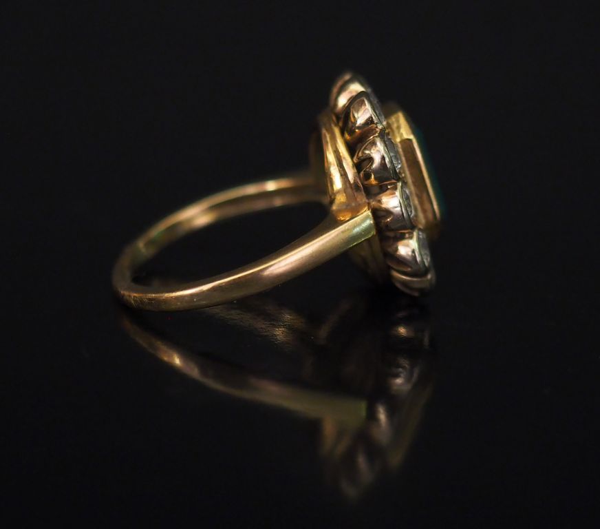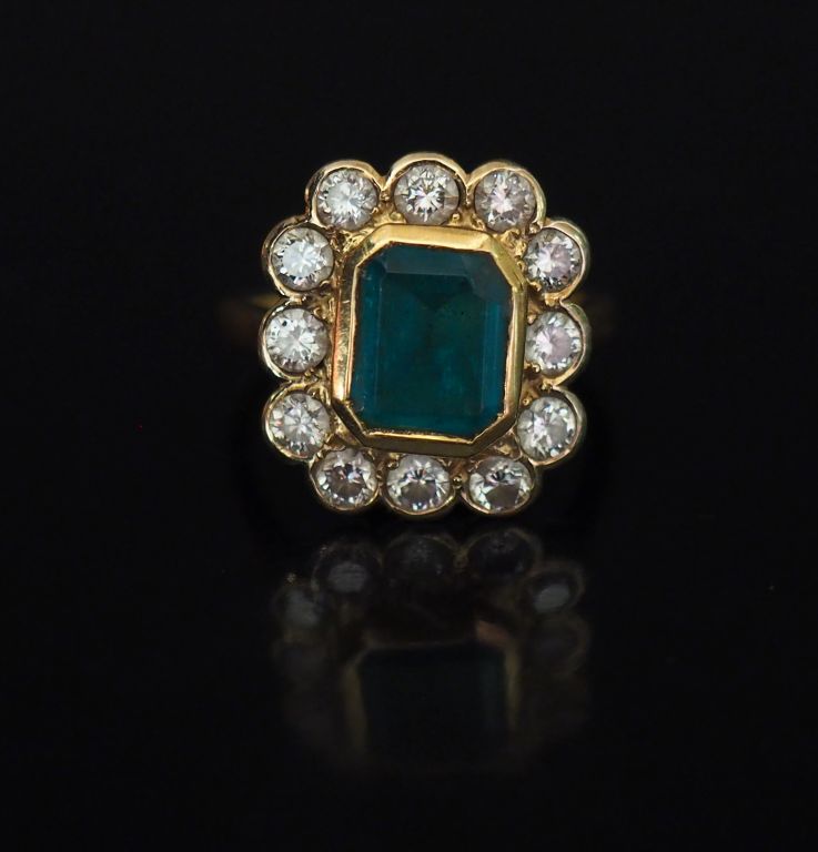 Bague de forme marguerite en or jaune, sertie en son centre d'une émeraude (Colombie ?) entourée de douze petits diamants. TDD. 54 Poids tel. 7,61 g (petits éclats à la pierre)