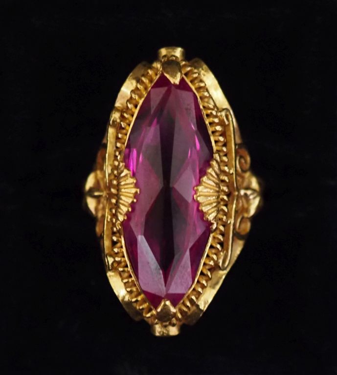 Bague de forme marquise en or jaune 750, sertie en son centre d'une pierre fantaisie rose. Monture ajourée, à décor de filigranes, d'étoiles et de coquilles. TDD. 47 Poids tel. 8,78 g (à charge de contrôle)