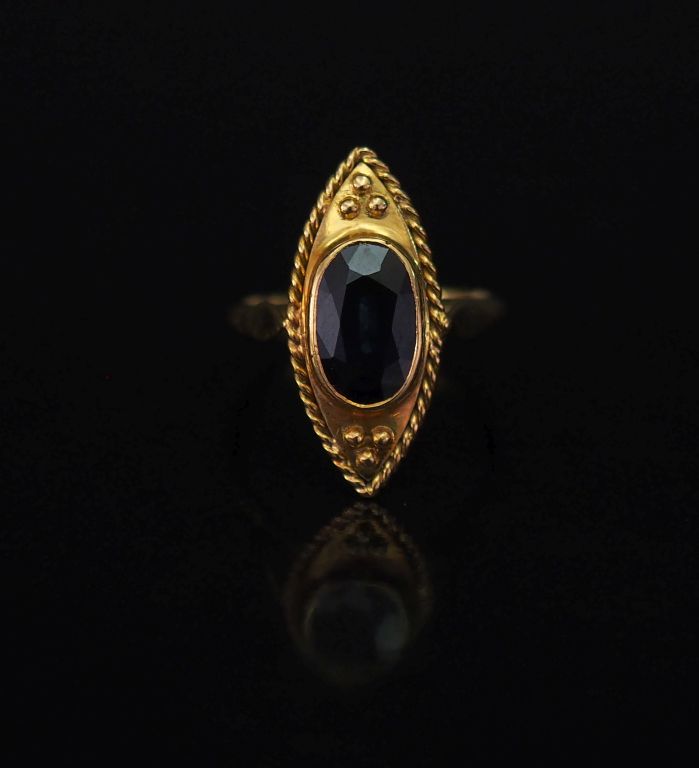 Bague de forme marquise en or jaune, sertie en son centre d’un saphir. TDD. 46 1/2 Poids tel. 4,35 g