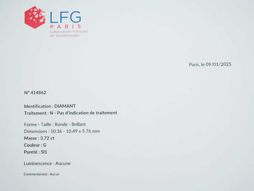 Bague de forme solitaire sertie en son centre d'un diamant taille ronde brillant de 3,72 ct, G SI-1. Examen Préliminaire du Laboratoire Français de Gemmologie en date du 9 janvier 2025.