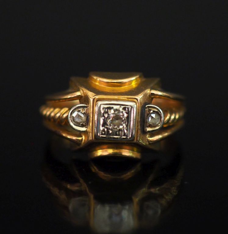 Bague de style 1940 en or jaune 750, sertie d'un petit éclat de diamant et de deux pierres à l'imitation du diamant. Jolie monture ajourée, à décor de motif torsadé. TDD. 56 Poids tel. 2,68 g