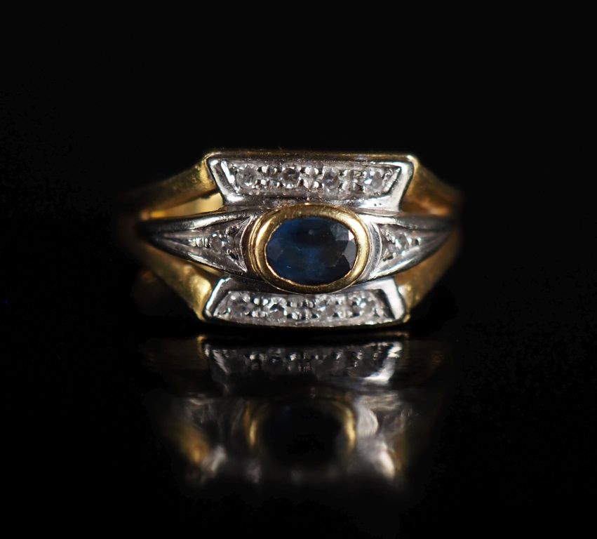 Bague de style Art Déco en or 750, saphir ovale entouré de roses Poids tel : 5,40 g