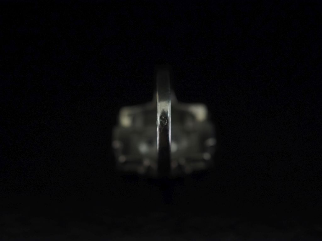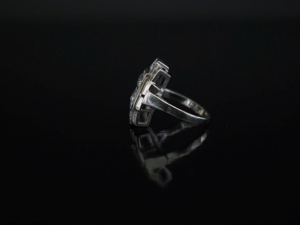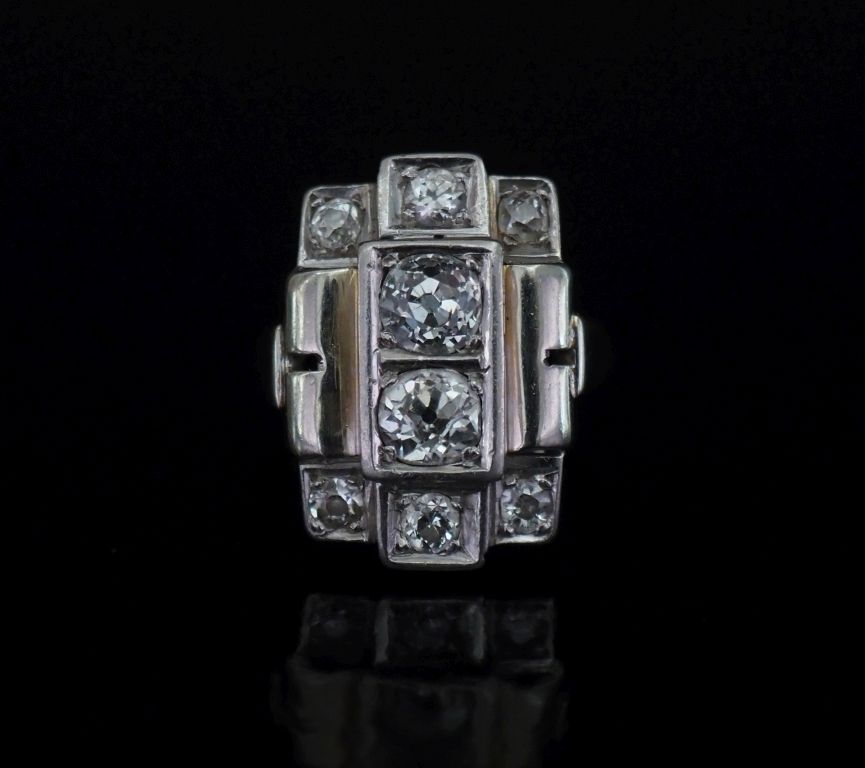 Bague de style Art déco en or blanc 750, sertie de huit diamants tailles ancienne. Les deux diamants centraux pesant environn 0,2 ct chaque. TDD. 49 Poids tel. 6,21 g