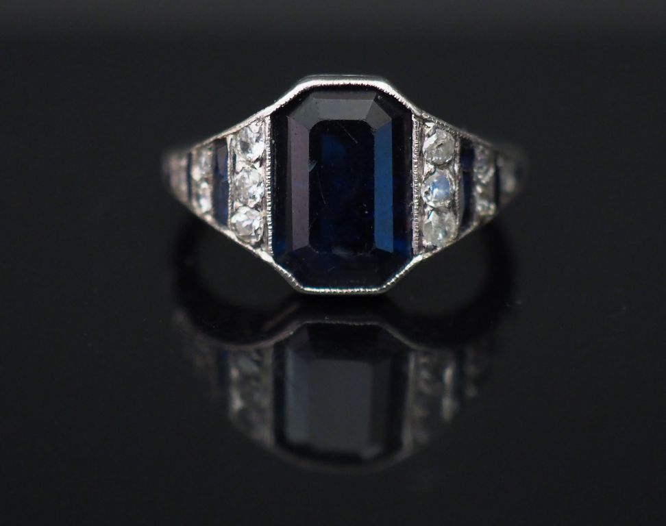 Bague de style Art déco en or blanc, sertie en son centre d'un saphir épaulé de lignes de petits diamants et saphirs calibrés alternées et en chute. TDD. 48 Poids tel. 4,12 g