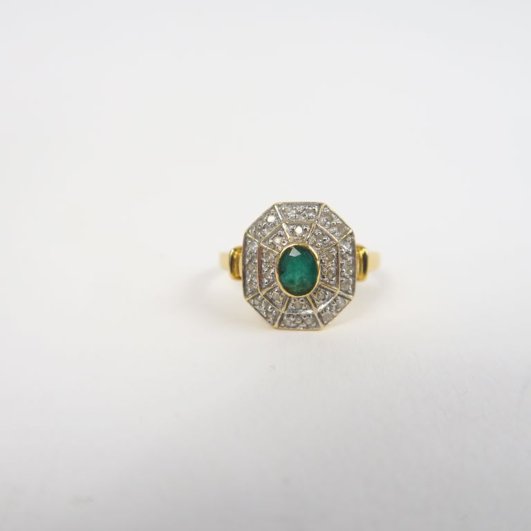 Bague de style Art déco en or jaune, ornée de petites roses et d'une émeraude. Poids. 3 g