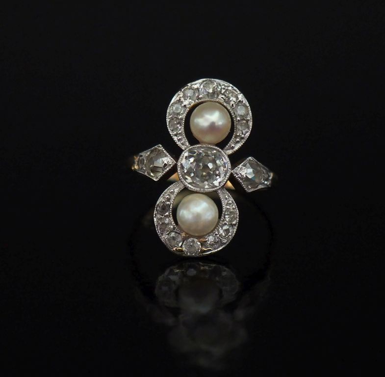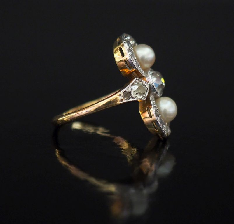 Bague dite "Toi Moi" en or jaune, sertie en son centre d'un diamant taille ancienne épaulé de deux petites perles blanches. Joli pourtour ajouré, serti de petits diamants. La monture agrémentée de part et d'autre de quatre petits diamants. TDD. Poids tel. 4,57 g