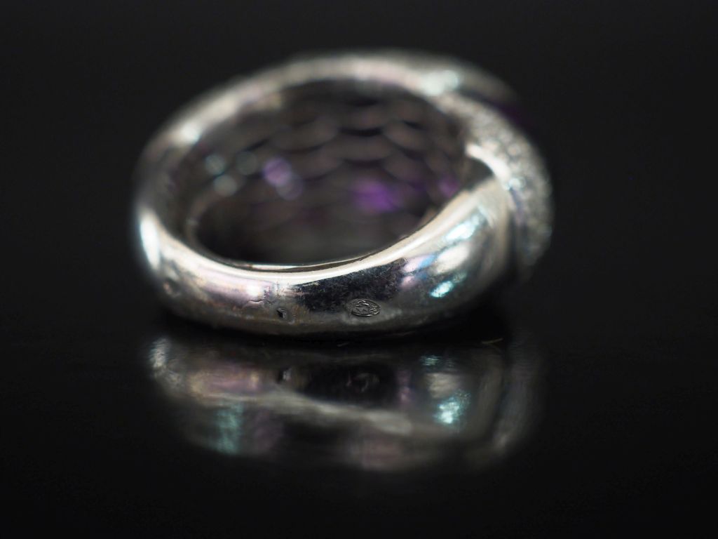 Bague dôme en or blanc, à décor de quartz violets et pavage de petits diamants alternés. TDD. 47 Poids tel. 13,10 g