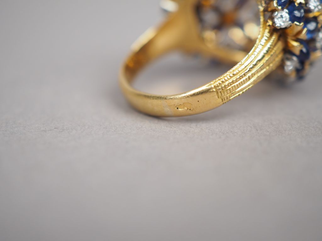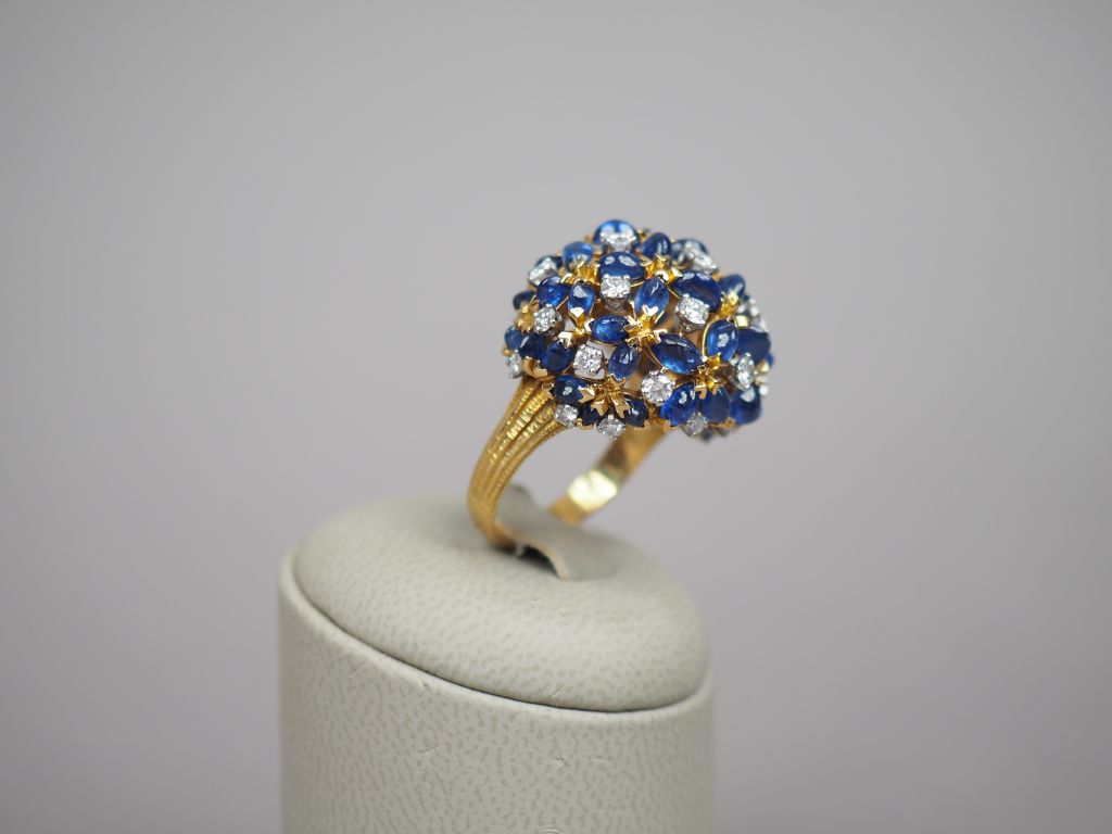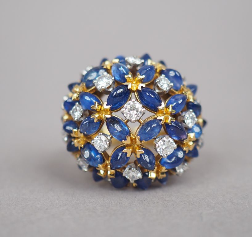 Bague dôme en or jaune, diamants et saphirs en cabochon, à décor ajouré. TDD. 60 Poids tel. 16,60 g