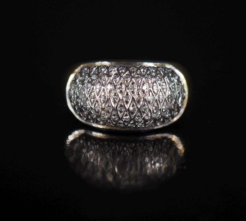 Bague dôme en or, semis de roses dans un croisillon