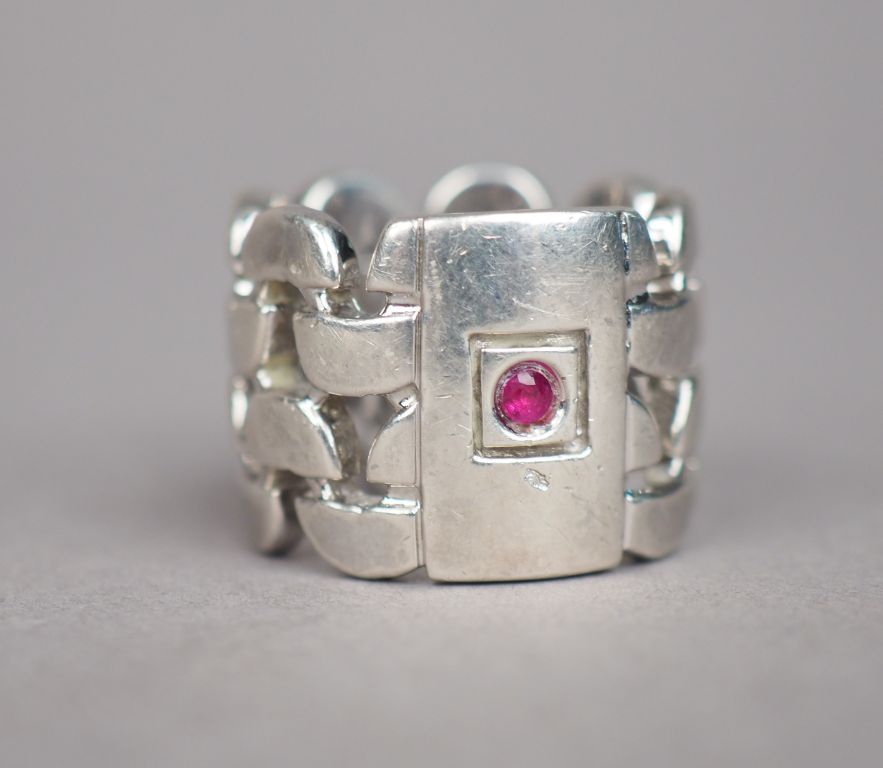 Bague en argent ajouré, à décor d'une pierre de couleur rouge. TDD. 50 Poids tel. 13,69