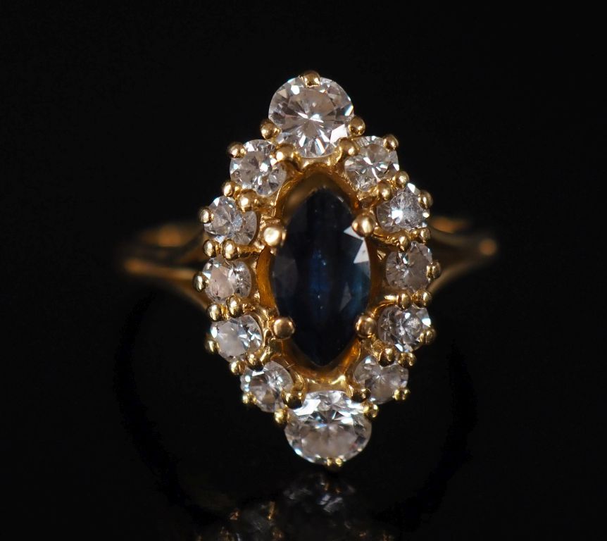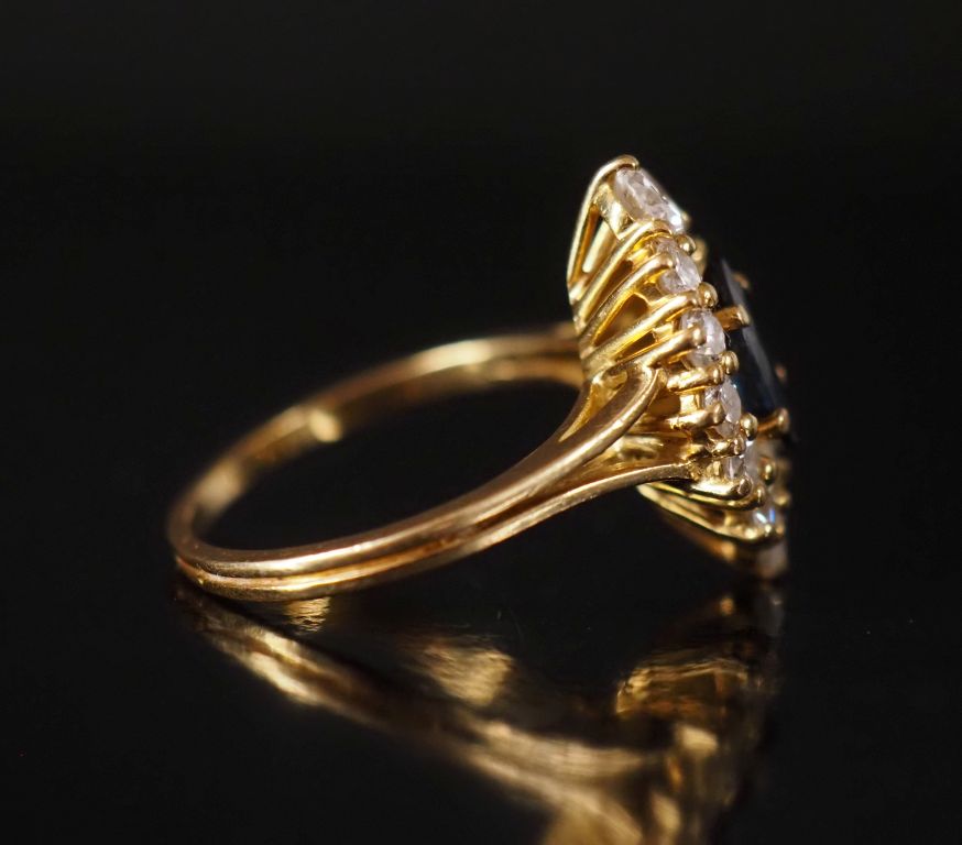 Bague en or 750, saphir de forme navette entouré de 12 diamants Poids tel : 3,9 g