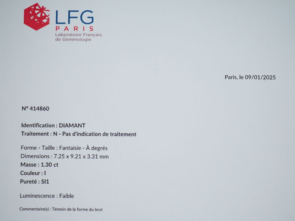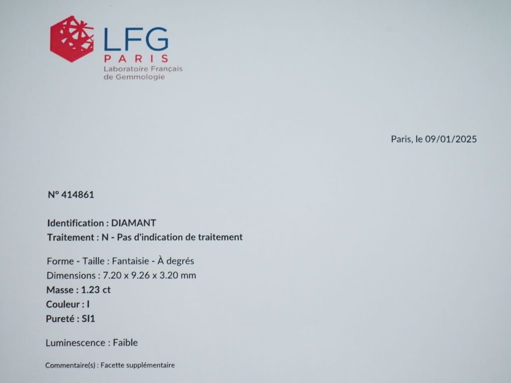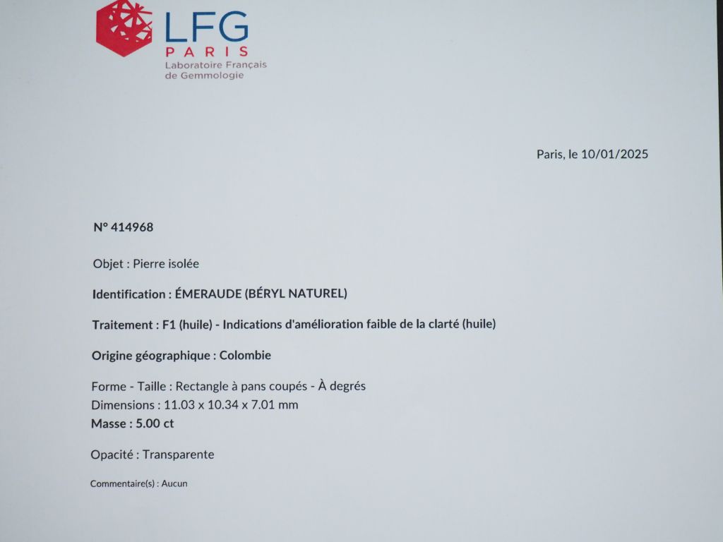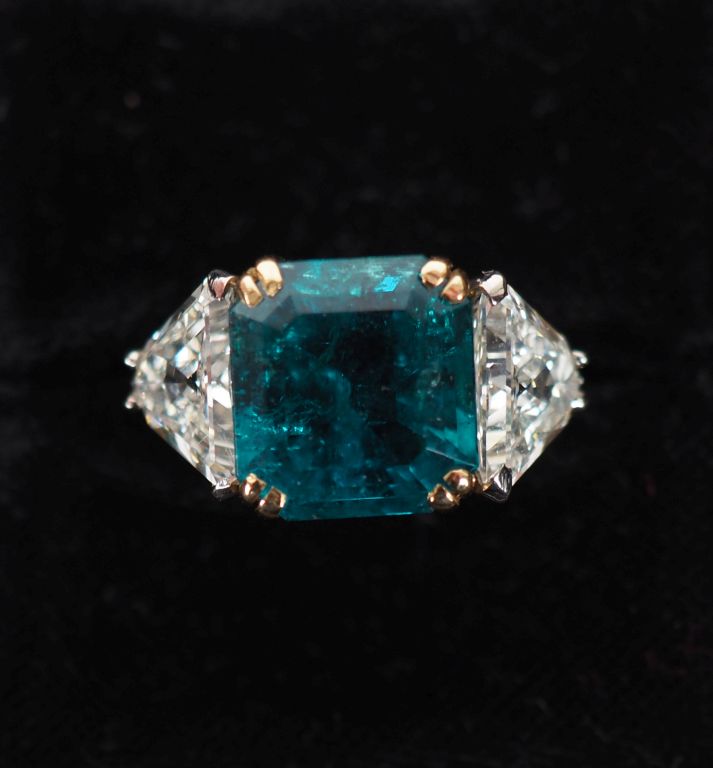 Bague en or blanc 750, sertie en son centre d'un émerauden de Colombie pesant 5 ct, épaulée de deux diamants de forme triangulaire pesant 1,30 ct et 1,23 ct. Chaque pierre est accompagnée d'un examen préliminaire établi par le Laboratoire Français de Gemmologie et précisant : - émeraude de Colombie de forme rectangulaire à pans coupés, taille à degrés. Traitement F1 (huile) - Indications d'amélioration faible de la clarté (huile). - diamant de forme fantaisie, taille à degrés pesant 1,30 ct couleur I, pureté SI1. Luminescence faible. - diamant de forme fantaisie, taille à degrés pesant 1,23 ct, couleur I, pureté SI1. Luminescence faible. Poids de la monture : 3,68 g (éclat à l'émeraude)