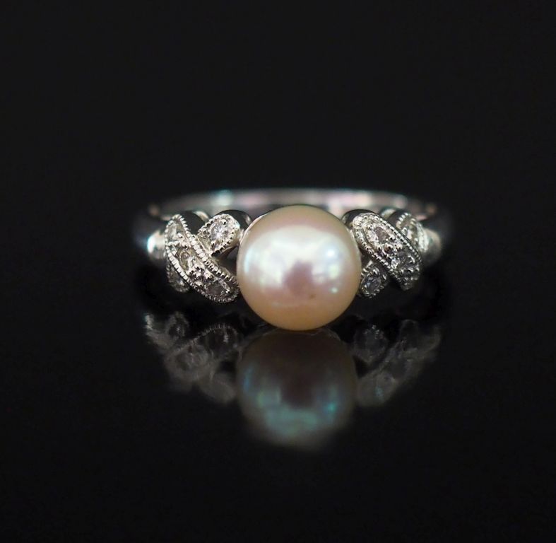 Bague en or blanc 750, sertie en son centre d'une perle blanche épaulée de part et d'autre d'un motif de croisillons, serti de petits diamants. TDD. 48 Poids tel. 3,06 g